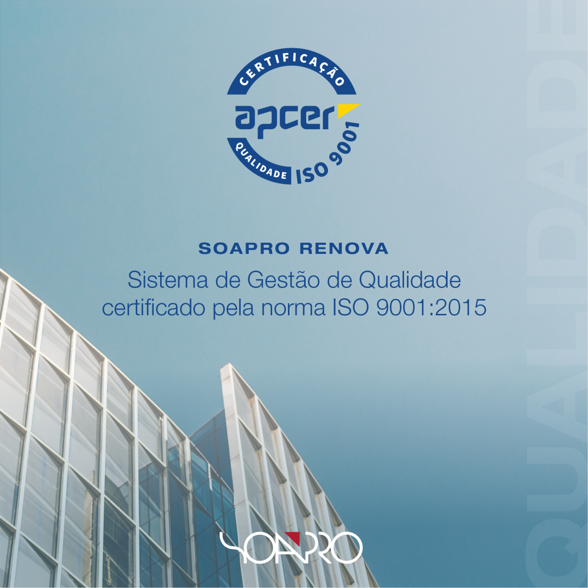 Lembramos aos nossos clientes e parceiros que a Soapro é certificada desde 2013, por demonstrar capacidade e eficácia em assegurar a melhoria contínua e o cumprimento de todos os requisitos da norma de Qualidade, mantendo-se operacional, conforme e relevante face à política e objectivos da organização, de modo a melhorar o desempenho global da organização.